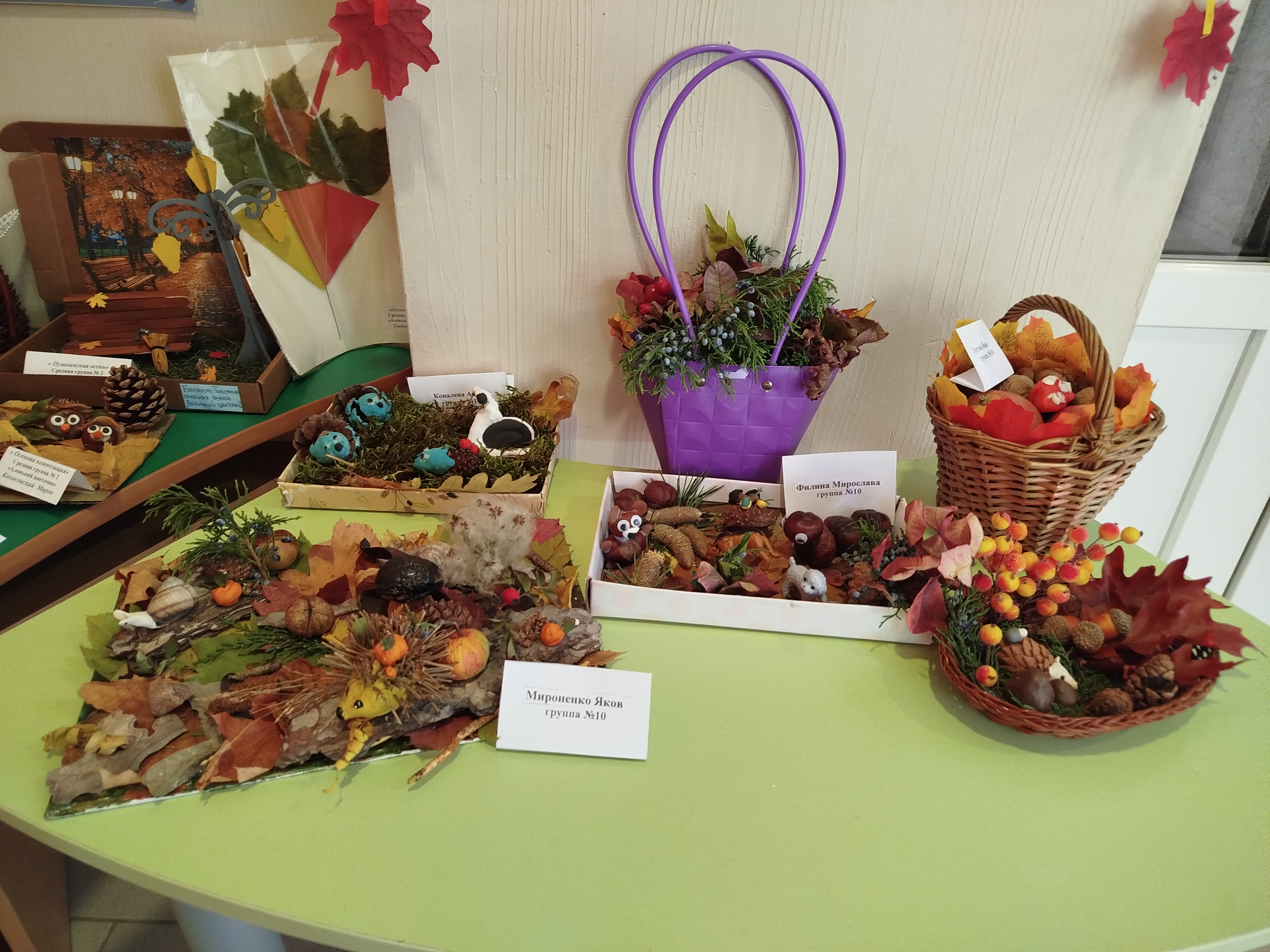 На выставке были представлены яркие аппликации, фигурки животных, композиции из сухих листьев. Дети использовали природные материалы для создания уютных и тёплых образов, отражающих красоту осени. Родители делились с детьми своими идеями и опытом, помогая им воплощать свои замыслы в жизнь.