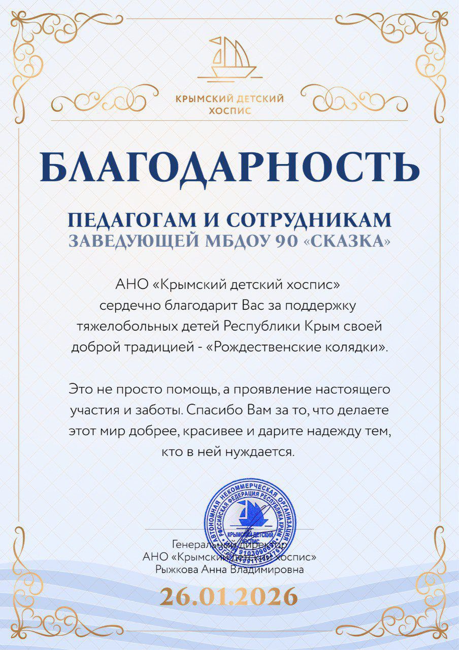 Благодарность коллективу детского сада "Сказка", родителям и воспитанникам от АНО "Крымский детский хоспис"